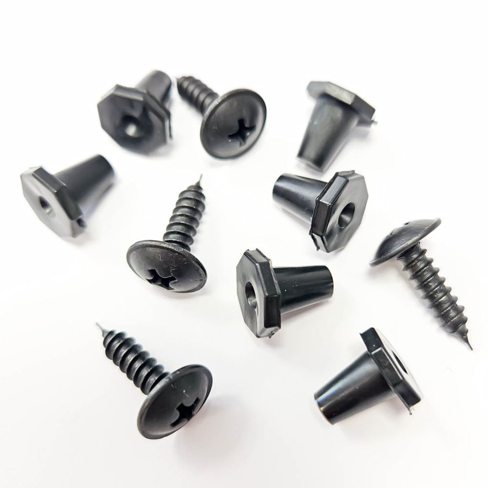 Komplektą sudaro savisriegiai (4vnt.) ir vibraciją slopinančios guminės apsaugos (6vnt.) numerių rėmeliui.